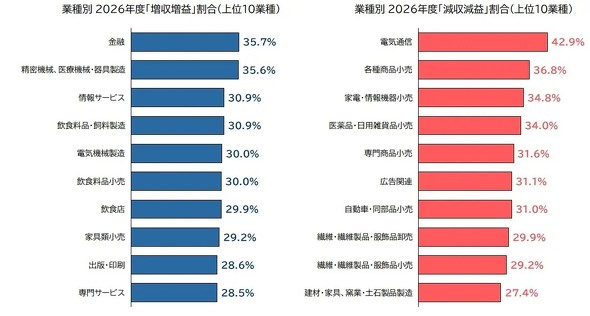 一方、「減収減益」が最も多かったのは「電気通信」(42.9%)で、唯一の4割台となった。以降、総合スーパーなどを含む「各種商品小売」(36.8%)、「家電・情報機器小売」(34.8%)、「医薬品・日用雑貨品小売」(34.0%)が続いた。