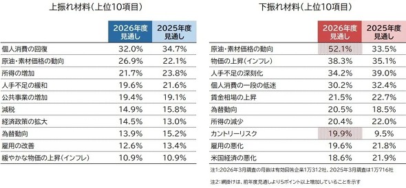 一方、下振れ要因は「原油・素材価格の動向」(52.1%)が最も多く、前年から18.6ポイント上昇した。「物価の上昇(インフレ)」(38.3%)、「人手不足の深刻化」(34.2%)、「個人消費の一段の低迷」(30.2%)が続いた。