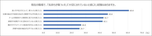 人材派遣事業などを手掛けるパーソルテンプスタッフ(東京都渋谷区)は、「職場での“傷つき体験”が仕事やパフォーマンス、キャリアに与える影響」について調査した。その結果、職場で傷ついた経験の1位は「言い方や伝え方によって傷ついた」(60.8%)だった。