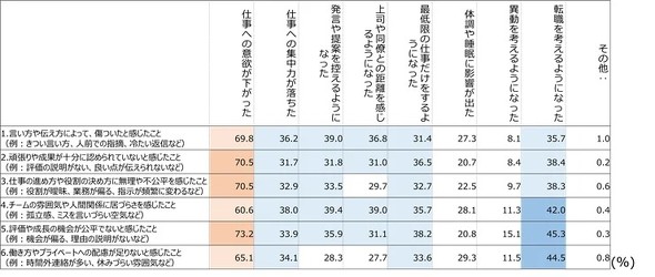 傷ついた経験がある人のうち、約7割が「仕事への意欲が下がった」と回答した。約3割は「最低限の仕事だけをするようになった」「発言や提案を控えるようになった」など、行動面でも変化が見られた。