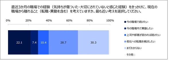 傷ついた経験をきっかけに職場を離れる可能性については「他社への転職を検討したい」は28.7%にとどまった。「今の職場で続けたい」(22.1%)、「上司や部署が変われば続けたい」(10.4%)、「今の職場内で異動したい」(7.4%)が続いた。