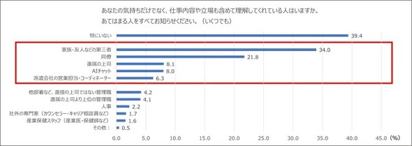 気持ちや立場を理解してくれる存在は、約4割が「特にいない」と回答した。一方、理解者がいる人の中では「家族・友人などの第三者」(34.0%)が最多で、「同僚」(21.8%)、「直属の上司」(8.1%)が続いた。