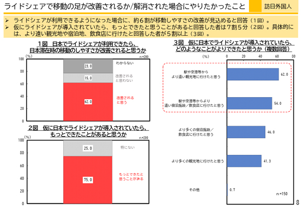 これは外国人観光客も同様で、先ほどの調査で「日本でライドシェアが利用できたら滞在時の移動しやすさが改善されると思うか」という質問に62.0%が「改善されると思う」と回答。「ライドシェアが導入されていたら、もっとできたことがあると思うか」という質問に対しては、75.0%が「もっとできたと思う」と回答した。つまり、ライドシェアが普及していないことが、観光面での機会損失を招いている可能性があるのだ。
