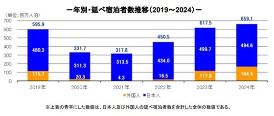 2024年の延べ宿泊者数は約6億5000万人となり、2019年の約5億9000万人を大きく上回っています。そのうち訪日外国人の延べ宿泊者数は1億6000万人を超えています。この多くを、ビジネスホテルが受け入れていると考えられます。