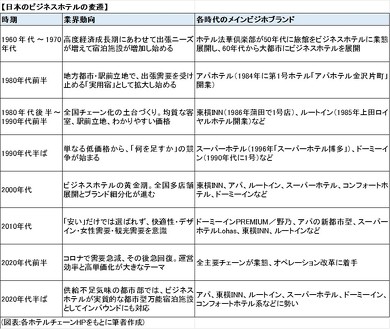 アパホテルの1号店開業が1984年、東横インの1号店開業が1986年。まさにこの頃から「都心や地方都市への出張需要を、ある程度標準化した小さな客室」で獲得するためのチェーンホテルの発想が広がり始めており、ビジネスホテル創成期と呼べる時代です。