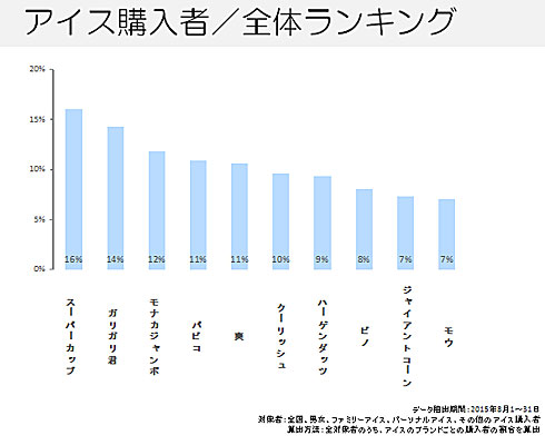 アイス購入者全体の中で最も割合が高かったブランドは、「明治エッセル スーパーカップ」(スーパーカップ)でした。2番目が「ガリガリ君」、次が「モナカジャンボ」という結果になりました(※)。