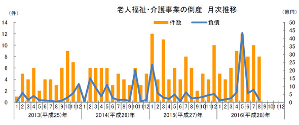 2016年1〜8月の「老人福祉、介護事業」の倒産件数は62件――。介護保険が施行された2000年以降でみると、過去最多を記録した前年(76件)を上回るハイペースで推移していることが、東京商工リサーチの調査で明らかになった。