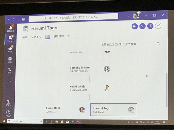 この他、地味な機能ではあるが、チームメンバーのプロファイルをのぞいて、当該の人物にひも付いた情報や組織図をたどる機能も搭載されている。先ほど「TeamsはMicrosoft/Office 365をベースに構築されている」と述べたが、そのセキュリティや検索機能の根幹になっているMicrosoft Graphを通じて必要な情報が任意に取り出せるようになっており、この機能もその一端ということなのだろう。