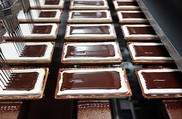 土肥: チョコのコーティングについて、もう少し詳しく教えてください。モナカは18山あるので、凸凹していますよね。普通に吹き付けているだけでは、ムラが出てくるのではないでしょうか?