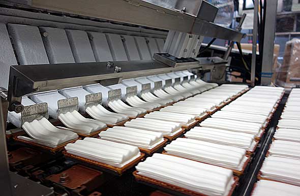 藤井: 繰り返しになりますが、モナカは18山ある。その山の部分にもバニラが満杯になるように、凸凹しているんですよね。お客さんに「おいしいなあ」と感じてもらえるように、バニラは満杯でなければいけません。チョコをコーティングするときと同じように、バニラもたくさん充てんすると、はみ出してしまう。そうなってはいけないので、ギリギリのところを狙わなければいけないんですよね。