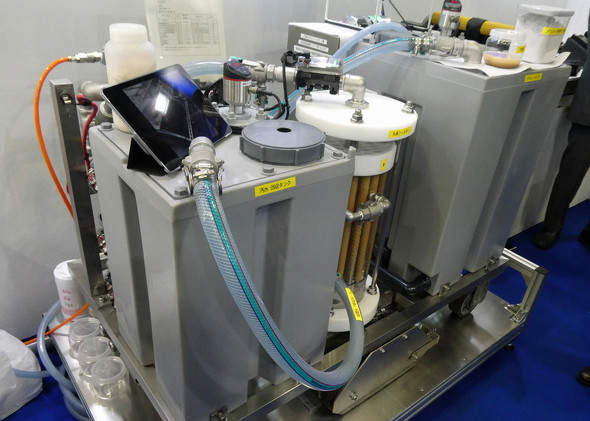 JR東日本テクノロジーが展示していた可搬式小型排水処理装置は、大型スーパーやホームセンターのショッピングカートほどの大きさで、洗浄現場に運び、その場で汚水を処理して排水溝に流せる。つまり車両洗浄汚水と同じ処理が可能になる。展示では空調用熱交換器の洗浄を想定していた。しかし、もしトイレや調理で発生する汚水も処理できたとしたら、ローカル路線のトイレ設置推進、観光列車の運行にも応用できそうだ。