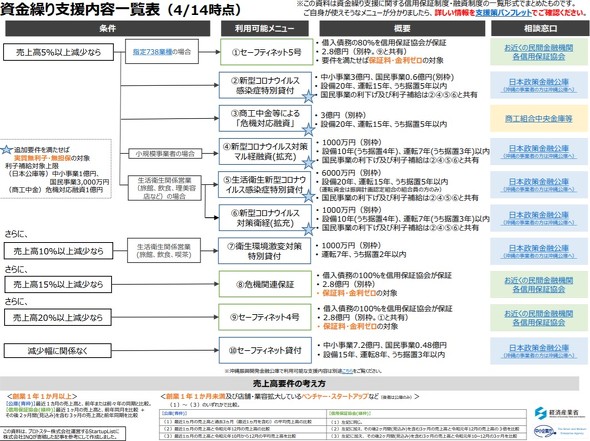 また、今後の補正予算案が通過すれば、この公庫融資と同等の融資が、都道府県の制度融資において用意されることになっている(つまり、実質無利子、無担保、据置最大5年、信用保証料減免、既往保証協会付き融資の借り替え可能という形)。これは、都道府県の制度融資として各都道府県などの信用保証協会の保証付き融資が準備されるというものであり、詳細は未確定ではあるが、補正予算通過となったタイミングで詳細を把握することができるだろう。