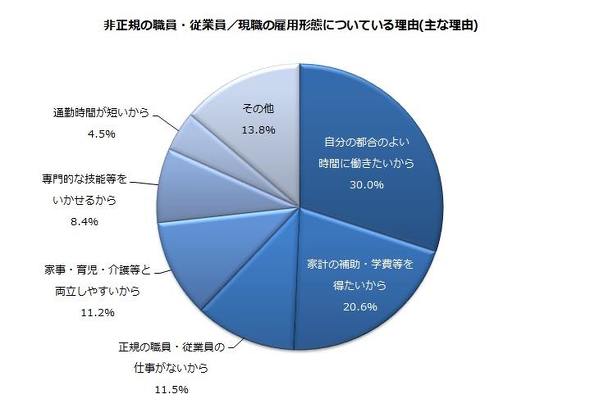 最も多かったのは「自分の都合のよい時間に働きたいから」という理由で30.0%。次に「家計の補助・学費等を得たいから」で20.6%。この2つだけで過半数に達します。続く3番目が「正規の職員・従業員の仕事がないから」で11.5%、さらに「家事・育児・介護等と両立しやすいから」が11.2%、「専門的な技能等をいかせるから」が8.4%となっています。