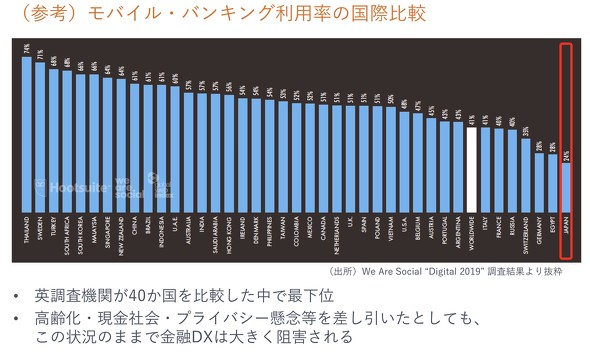 ネットバンキングの普及率は低い。日本銀行が6月に行った調査によると、個人のネットバンキングの利用率は23.6%、法人は27.4%でしかない。この契約を増やしていくのが重要だと瀧氏は言う。「ネットバンキングは金融DXの初歩。にもかかわらず進んでいない。金融DXを唱える以上は、ネットバンキングを使えるようにしておかないと進まない。ネットバンキング利用率を少なくとも計測すべきだ。私たちはKPIを置くべきだと思っている」