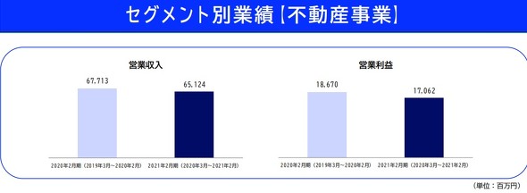 不動産部門はどうか。まず、不動産賃貸事業では、コロナの影響で商業施設が時短営業や臨時休館を実施したため、賃料を免除したり、保有する物件の入居テナントに対して賃料減額の措置を講じたりした。そのため、通期では減収減益となった。不動産保守・管理事業では、商業施設の経済活動が再開したことで、受注回復の動きがみられた。しかし、第1四半期の臨時休業の影響が残り、こちらも通期では減収減益となった。こうした結果、不動産事業全体では、営業収入が651億円(3.8%減)、営業利益が171億円(8.6%減)となった。大きく苦戦した映画事業や演劇事業と比べ、減少幅は少なかった。