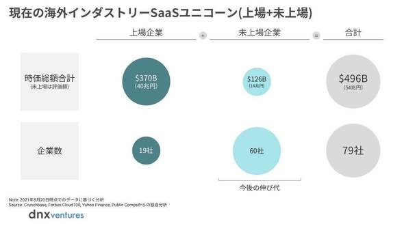 バーティカルSaaSのグローバル水準を確認していくと、米国を中心に上場企業数で19社、時価総額合算ベースで40兆円、未上場では企業価値が1000億円以上のユニコーン企業は60社、企業価値算出合算ベースで19兆円と巨大な投資規模となっている。