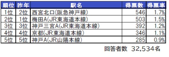 住みたい駅ランキング1位は西宮市の西宮北口だった。次いで梅田A(3つ以上の近接駅を統合しており、今回は梅田・阪急神戸線の大阪梅田・阪急本線の大阪梅田・大阪・北新地・西梅田・東梅田)、神戸三宮A(三ノ宮・阪急神戸線の神戸三宮・阪神本線の神戸三宮・神戸高速鉄道東西線の神戸三宮・三宮・花時計前)と続いた。