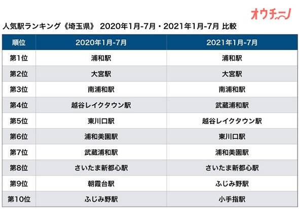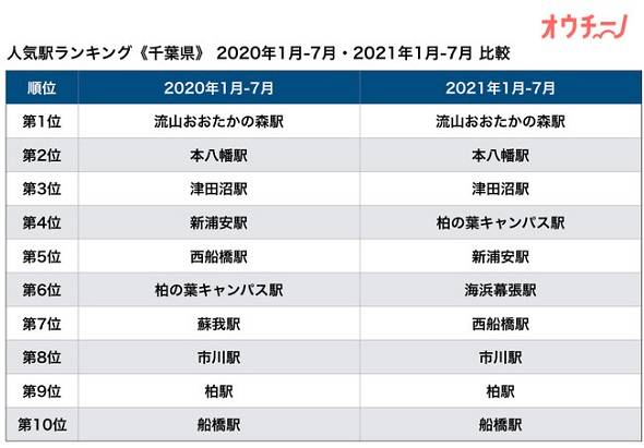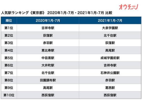 オウチーノは、21年1〜7月の期間と前年の同じ期間の首都圏(東京都、神奈川県、千葉県、埼玉県)人気駅ランキングを発表した。今年はどのような変化があったのか。