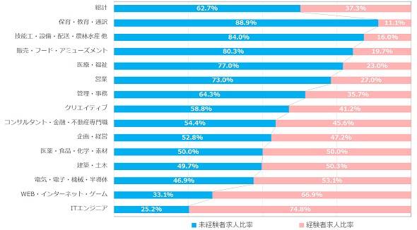 掲載求人の中で経験者求人の比率が最も多かった職種は「ITエンジニア」で74.8%、次いで「WEB・インターネット・ゲーム」が66.9%、「電気・電子・機械・半導体」が53.1%だった。