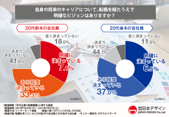自身の将来のキャリアについて、転職を経(へ)た上で明確なビジョンはあるか聞いたところ、20代前半では4割以上が「明確に決まっている」(7.1%)、「ある程度決まっている」(33.3%)と回答し、20代後半も4割以上が「明確に決まっている」(6.5%)、「ある程度決まっている」(37.0%)と回答した。