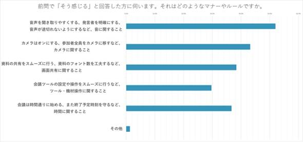 どのようなマナー・ルールかの問いに、「音声を聞き取りやすくする、発言者を明確にする、音声が途切れないようにする」など、音に関することと回答した人が50.2%、「カメラはオンにする、参加者全員をカメラに映す」など、カメラに関することが43.2%、「資料の共有をスムーズに行う、資料のフォント数を工夫する」など、画面共有に関することが38.4%という結果だった。