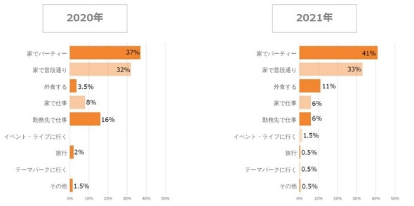 クリスマスの過ごし方としては、「家でパーティー」(41%)が最も多かった。2位は「家で普段通り」(33%)、3位は「外食する」(11%)となった。4位は「家で仕事」「勤務先で仕事」(同率6%)という結果に。家でパーティーが多くを占めたものの、いつも通りに過ごす人も一定数いることが分かった。