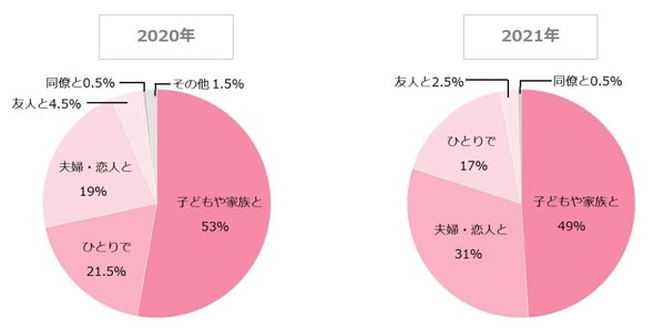 誰と過ごすかについては、「子どもや家族と」(49%)が約半数を占めた。次いで「夫婦・恋人と」(31%)が、昨年調査(19%)と比較して割合が増える結果に。同社は「昨年、コロナ禍で会うことができなかったカップルが今年は一緒に過ごす計画を立てている可能性がある」と分析した。