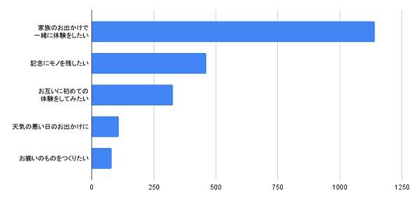 アウトドア体験と同様に「子供にいろんな経験をしてほしい」「子供と初めての体験を一緒にしたい」という視点で遊びを選んでいる親が多いことが分かる。