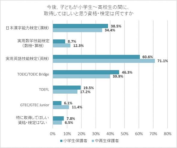 子どもが高校生までの間に取得してほしいと思う資格・検定があるか尋ねた。最も多かったのは、「実用英語技能検定(英検)」(小学生60.6%、中高生71.1%)、次いで「TOEIC/TOEIC Bridge」(小学生46.3%、中高生39.9%)だった。英語に関する資格・検定を取得してほしいと考えている保護者が多いことが分かった。