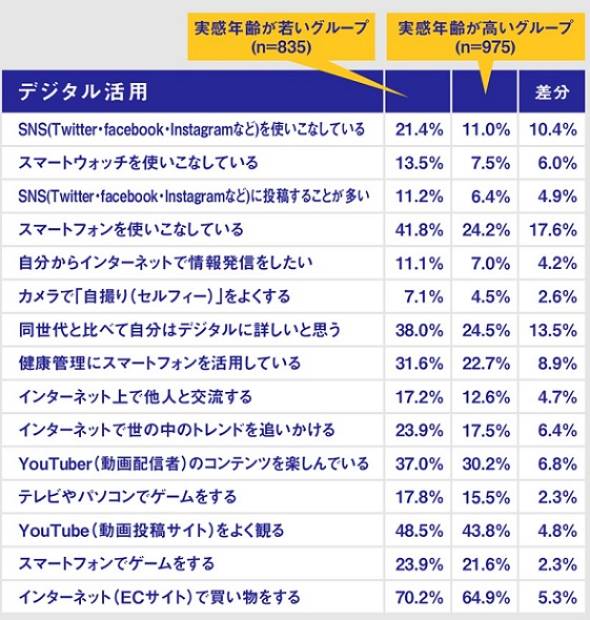 実感年齢を実年齢より若く答えた人は、高く答えた人に比べ、「デジタルに詳しい」「スマホ、SNSを使いこなせている」と回答した割合が10%以上高かった。実感年齢が若い人はデジタルリテラシーが高く、活発に活動し、その必需品としてデジタルアイテムを使用していると推測される。