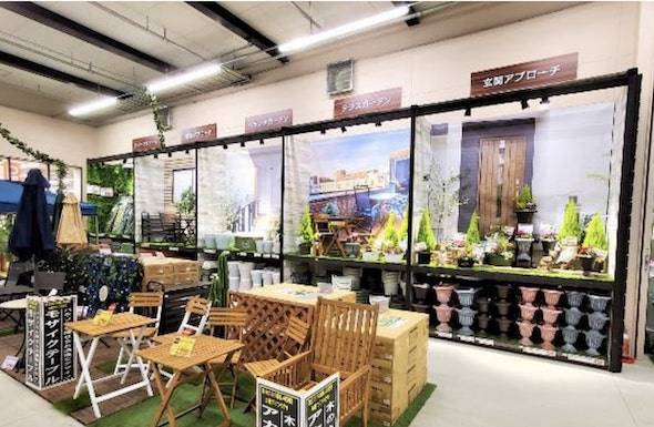 ガーデンコーナーではグリーンのある暮らしの空間づくりを提案。切り花や鉢植えなどのほかに、植物を長く健康に育てるための土、肥料に加え、ガーデニング作業に必要な道具も取り扱う。また、庭にくつろぎの空間をつくるベンチ、パラソル、レンガなどを充実させつつも、室内でもインテリアとしてグリーンを楽しめるように大小さまざまな観葉植物を取りそろえる。