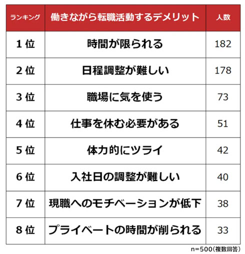 働きながら転職活動をするデメリットについて聞くと、1位は「時間が限られる」(182人)、2位は「日程調整が難しい」(178人)、3位は「職場に気を使う」(73人)、4位は「仕事を休む必要がある」(51人)、5位は「体力的にツライ」(42人)だった。