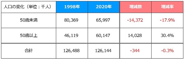 定年年齢を60歳以上とするよう義務付けた改正高年齢者雇用安定法が施行されたのは、98年です。総務省の人口推計で、98年当時と直近のデータである20年の年齢構成を比較してみると、50歳未満と50歳以上の比率は以下のようになります。
