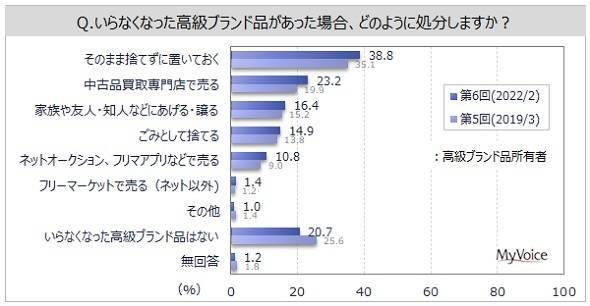 いらなくなった高級ブランド品の処分方法は、1位が「そのまま捨てずに置いておく」で38.8%、2位が「中古品買い取り専門店で売る」で23.2%、3位は「家族や友人・知人などにあげる・譲る」で16.4%、4位は「ごみとして捨てる」で14.9%、5位は「ネットオークション、フリマアプリなどで売る」で10.8%という結果だった。