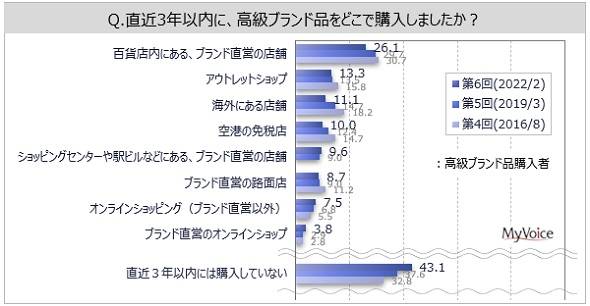 直近3年以内で高級ブランド品を購入した場所を尋ねた。1位は「百貨店内にある、ブランド直営の店舗」が26.1%、2位は「アウトレットショップ」で13.3%、3位は「海外にある店舗」で11.1%だった。女性10〜20代では、「オンラインショッピング(ブランド直営以外)」の比率が高い特徴があった。