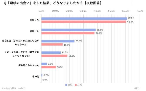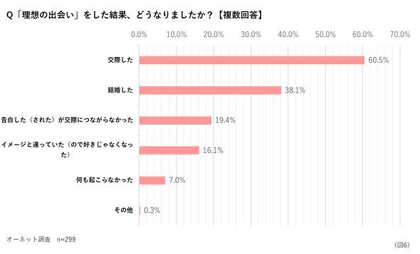 「理想の出会い」をした結果、どうなったか聞いた。最も多かったのは、「交際した」で60.5%、次いで「結婚した」が38.1%、「告白した(された)が交際につながらなかった」が19.4%だった。「理想の出会い」をすると、その後の交際や告白といった過程に進みやすいかもしれないと同社は分析する。