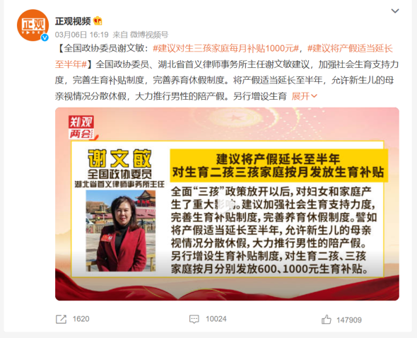 政協委員で弁護士の謝文敏氏は、産休の分割取得や男性の育休拡大に加え、2人目の子どもに月額600元(約1万1000円)、3人目には月額1000元(1万8000円)の手当支給を提言したが、すぐに女性たちから中国ならではのブーイングが殺到した。