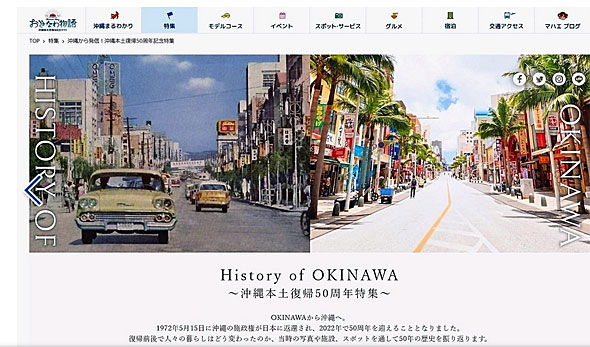 復帰関連の商品やサービスの開発が進む中、沖縄観光コンベンションビューロー(OCVB)は観光情報サイト「おきなわ物語」で、復帰前後の歴史を振り返る特集ページを公開。2月28日の公開から15日間でアクセス件数を示す「ページビュー」は3722。復帰世代の50〜60代がアクセス数の6割を占めており、関心の高さがうかがえる。