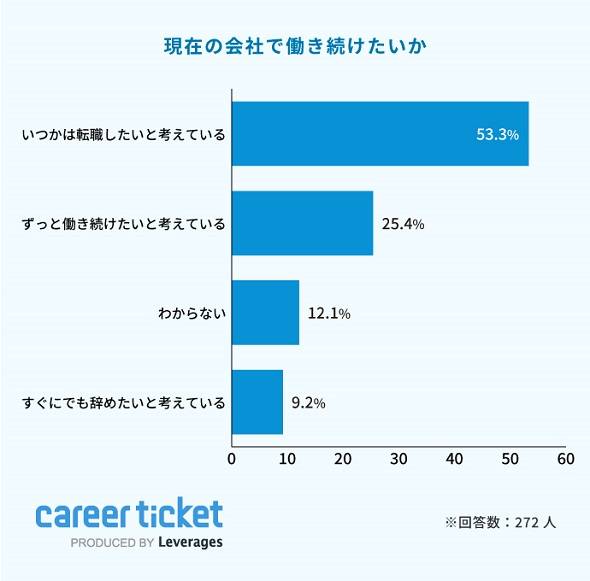 現在も新卒で入社した企業で働く社員に、今の会社で働き続けたいか聞いたところ、「いつかは転職したい」と答えた割合は53.3%と半数以上に上った。