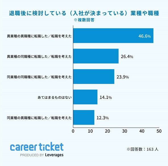 退職を検討したことのある人もしくはすでに退職をしている人に、退職後に検討している(入社が決まっている)業種や職種を尋ねた。46.6%が「異業種の異職種に転職した/転職を考えた」と回答。退職したい理由に「仕事内容が合わない」が挙がっていることから、異業種や異職種を視野に入れた人が多いことが分かる結果となった。