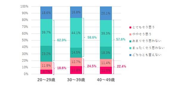 年代別に見ると全体的なバランスに大差はないものの、「入りたい」と思う割合は20代が最も低く18.6%、「入りたいと思わない」と答えた割合は62.9%で、30、40代に比べて高くなった。