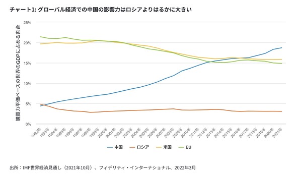 中国はロシアよりもグローバル経済への影響が大きく、先進国の市場とより深く結び付いている点には留意する必要があります。購買力平価ベースの世界のGDPに占める割合はロシアが3.1%にとどまる一方、中国は18.7%に達します。