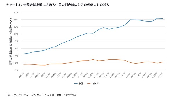 さらに、貿易に関して言えば、その違いは格段に大きくなります。世界の輸出額に占める中国の割合は14.2%で、ロシアはわずか2.2%(輸入額のシェアは中国が10.5%、ロシアは1.2%)です。