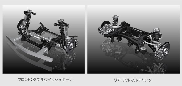 ストラットでは上側のダンパー取り付け点がすなわち車軸の軌跡の傾きを決めるのに対して、ダブルウィッシュボーンでは、上下アームとダンパーの関係は自由である。なんならリンクを介して水平にだって置けるし、そもそもアームの支点は仮想軸であることが多い。結果として、ピッチングセンターをホイールベースの間から追い出すことができた。