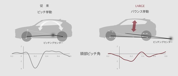 するとどうなるか。従来ならシーソーのように、タイヤの入力に対してギッタンバッコンと動いていたボディは、ボディ後方のピッチングセンターを軸にした上下運動になる。上下運動にさえしてしまえば、サスペンションの得意なモーションなので制御が圧倒的にし易くなる。しかも動きが単純化された結果、ドライバーにとっても動きが予想しやすい。