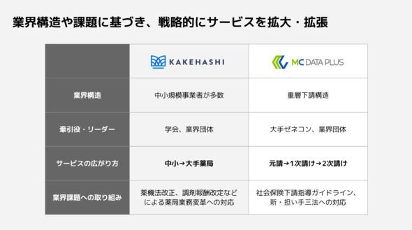 調剤薬局向けに電子薬歴システムを提供するカケハシ、建設業界で労務安全書類作成・管理クラウドサービスを展開するMCデータプラス。国内でも屈指のユーザー規模を持つSaaS企業は今後の成長をどのように描いていくのか。それぞれの領域で大きな存在感を示す2社の代表対談を企画し、バーティカルSaaS拡大に向けた戦略の要点を聞いた。