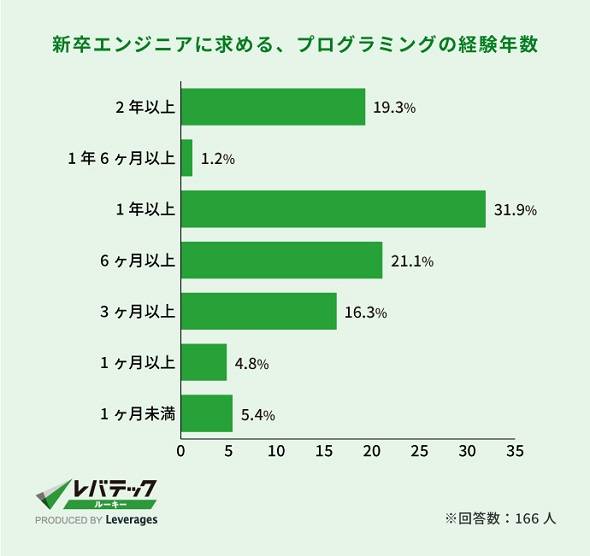 企業側が新卒エンジニアに求めるプログラミング経験年数で最も多かったのは、「1年以上」(31.9%)、次いで「6カ月以上」(21.1%)、「2年以上」(19.3%)だった。全体の半数以上の企業が、1〜2年以上のプログラミング経験を求めていることがうかがえた。