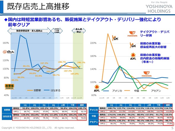 一方で吉野家事業はコロナ前比で9割という状況だったようです。テークアウトも多く一定の需要は保たれていたようですね。