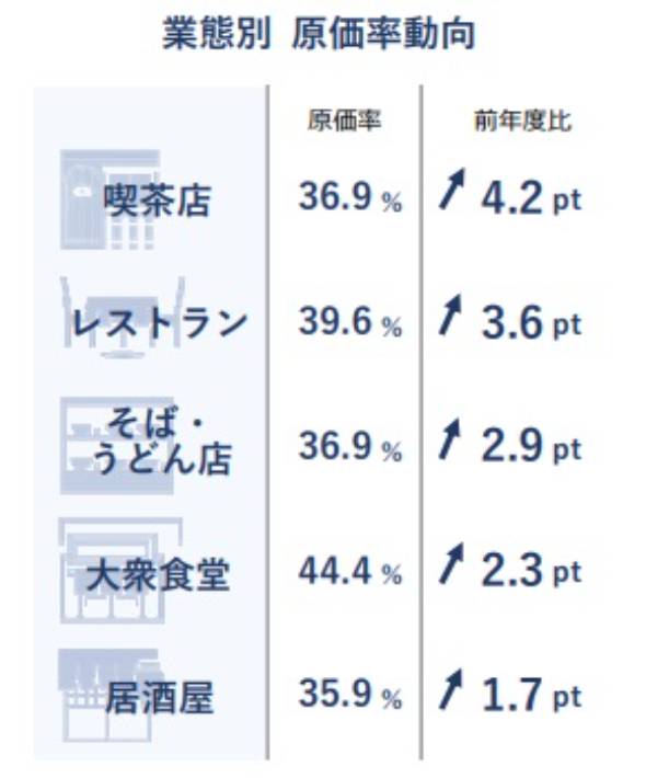 「イタリアン」や「フレンチ」などのレストラン(39.6%)は3.6ポイント上昇。「そば・うどん店」(36.9%)は2.9ポイント、「大衆食堂」(44.4%)は2.3ポイント、「居酒屋」(35.9%)は1.7ポイント上昇した。居酒屋などではアルバイト確保のための人件費増、コロナ禍でテークアウトなどに注力した企業では、デリバリースタッフを配置するための人件費増も負担となった。