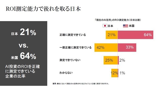1つはAI投資のROI(投資利益率)の正確な測定能力だ。米国の企業は64%が「正確に測定できている」と回答したのに対し、日本企業は21%にとどまった。「測定できていない」「わからない」の合計は米国の3%に対し、日本は37%と遅れが顕著になっている。